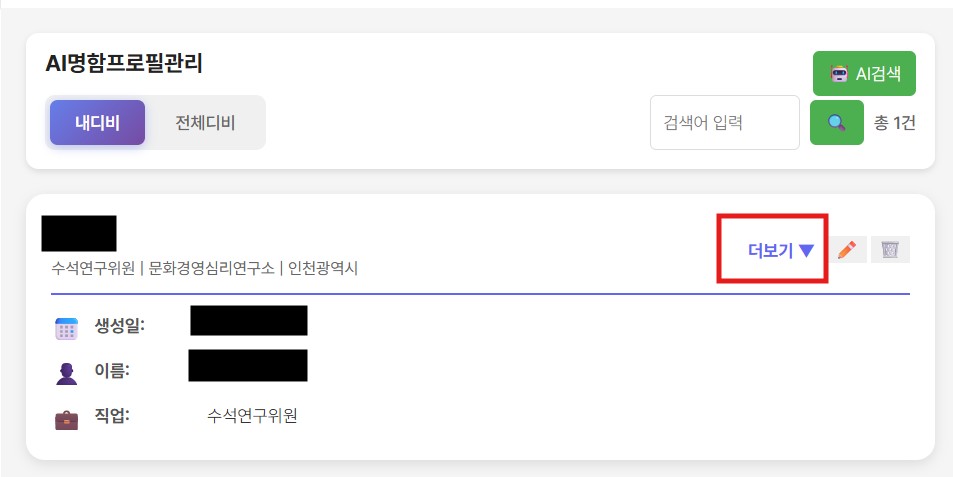 AI 프로필 확장은 명함, 회원가입, 이벤트 신청 등을 통해 입력된 기본 정보만으로, AI가 웹에 공개된 정보를 정밀 분석하여 한 사람의 비즈니스·경력·활동 이력을 자동으로 확장해주는 혁신적인 기능입니다.