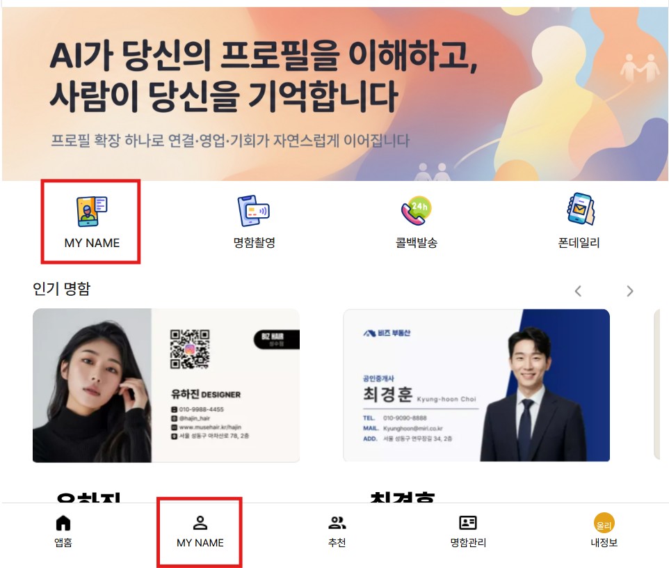 올리네임의 "MY NAME"은 상대방이 나를 빠르고 정확하게 이해하도록 돕는 핵심 공간입니다.