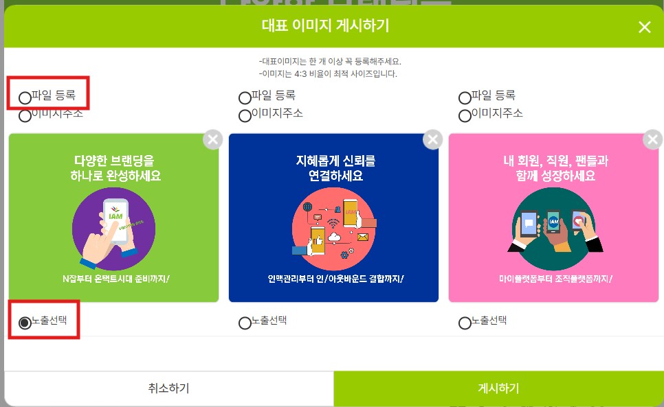 4."파일등록" 체크 후 내파일의 이미지를 선택하고 ‘노출 선택’을 체크