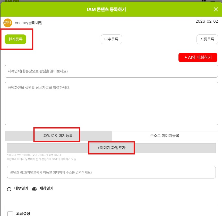 6.콘텐츠 등록 창이 나오면 이미지 업로드 후 저장하기